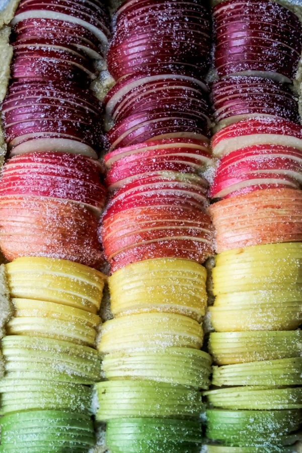 5. Using a small offset spatula, spread the almond frangipane in an even layer on the crust. Then begin to arrange your apples, creating a rainbow gradient effect, leaving a 1-inch border of crust on all sides. Fold the crust up the apples. It will rustic and not perfect and that's lovely.