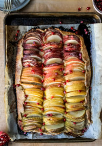 Before all else, I knew that I wanted to showcase the incredible varieties and colors of apples that I find, local to me in northeast PA. I’m a sucker for a rainbow and love vibrant gradients. The apples retain their shape, and become soft and jammy on the inside. As delicious as apples are, they need a little help when baked. I love love love almond-flavored anything, and a smooth frangipane has never done me wrong. Frangipane is the perfect compliment to the thinly sliced apples. And the final layer? A rustic pie crust made with fruity olive oil, almond milk, and a couple tablespoons of buckwheat flour. Hi, hello, it’s vegan and damn delicious. I’m not vegan, but I love a plant-based moment any day of the week.