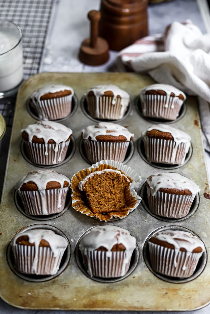 perfectly spiced soft gingerbread muffins with a sweet vanilla bean glaze
