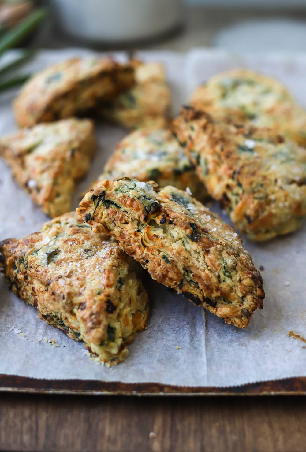 You can usually find scones in two common shapes: round and wedge-like triangles. For these delicious savory scones, I went with a generous wedge shape for two reasons. First, I didn’t want any leftover scraps to re-roll. Second, I love a generous savory scones that a very substantial snack, or even a light meal.