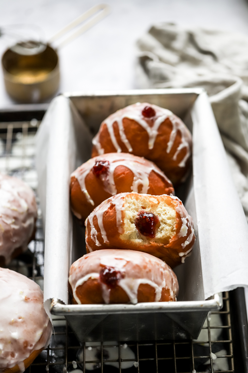 Eat your jelly doughnuts when they’re fresh! The glaze takes about 20 minutes to set, then enjoy them right away. Of course, if you have any leftover, store them in an airtight container for up to 2 days at room temperature.