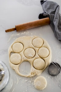 4. Transfer the dough onto a well-floured work surface and sprinkle the top of the dough with more flour. Flour a rolling pin and roll out dough to about 1/2-inch thickness. Use a 3-inch round cutter, cut out 9 dough rounds. Cover the dough rounds with a clean kitchen towel.