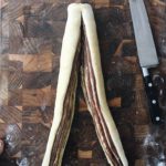 • Step 4 Trim last 1/2-inch off each end of log. With a sharp chef’s knife, cut the log in half lengthwise, leaving about an inch attached at the top. Lift one side over the next and begin to twist, trying to keep the cut sides facing out, which looks super pretty. Don’t worry if this step makes a mess, just transfer the twist as best as you can into the prepared loaf pan. Cover the loaf pans loosely with plastic wrap, and let rise for 1-1 1/2 hours depending on the room temp temperature.