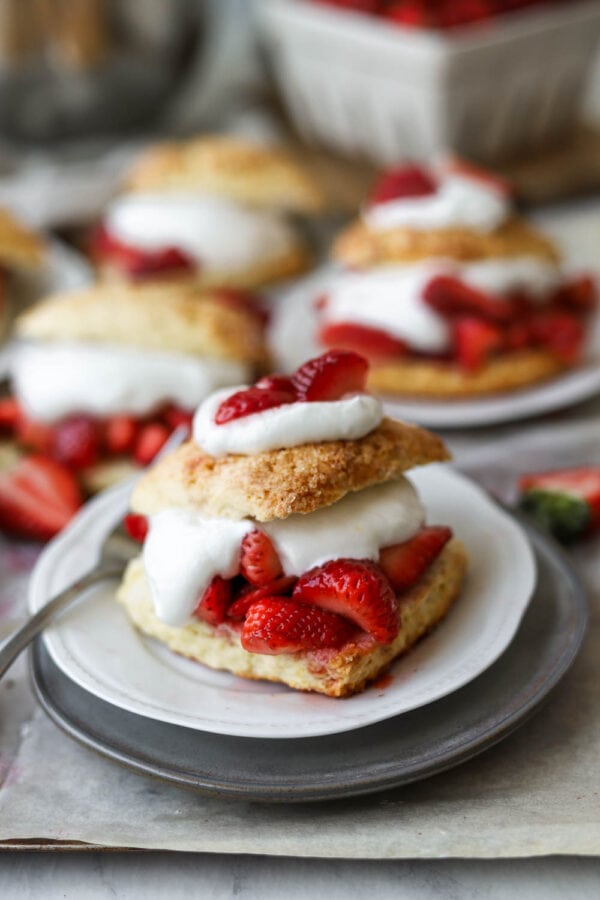 These Fresh Strawberry Shortcakes are best eaten fresh out of the oven, once they’re mostly cooled. It’s also really important to assemble the shortcakes with the berries and cream right before you are going to serve them. The shortcakes can be made a few hours in advance, and stored at room temperature in an airtight container. When you’re ready to serve, just split them in half and fill. I know we all the ability to freeze baked goods, but i really wouldn’t recommend freezing these shortcakes. A LOT gets lost in the freezer here, and they’re just 99x more delicious when fresh.