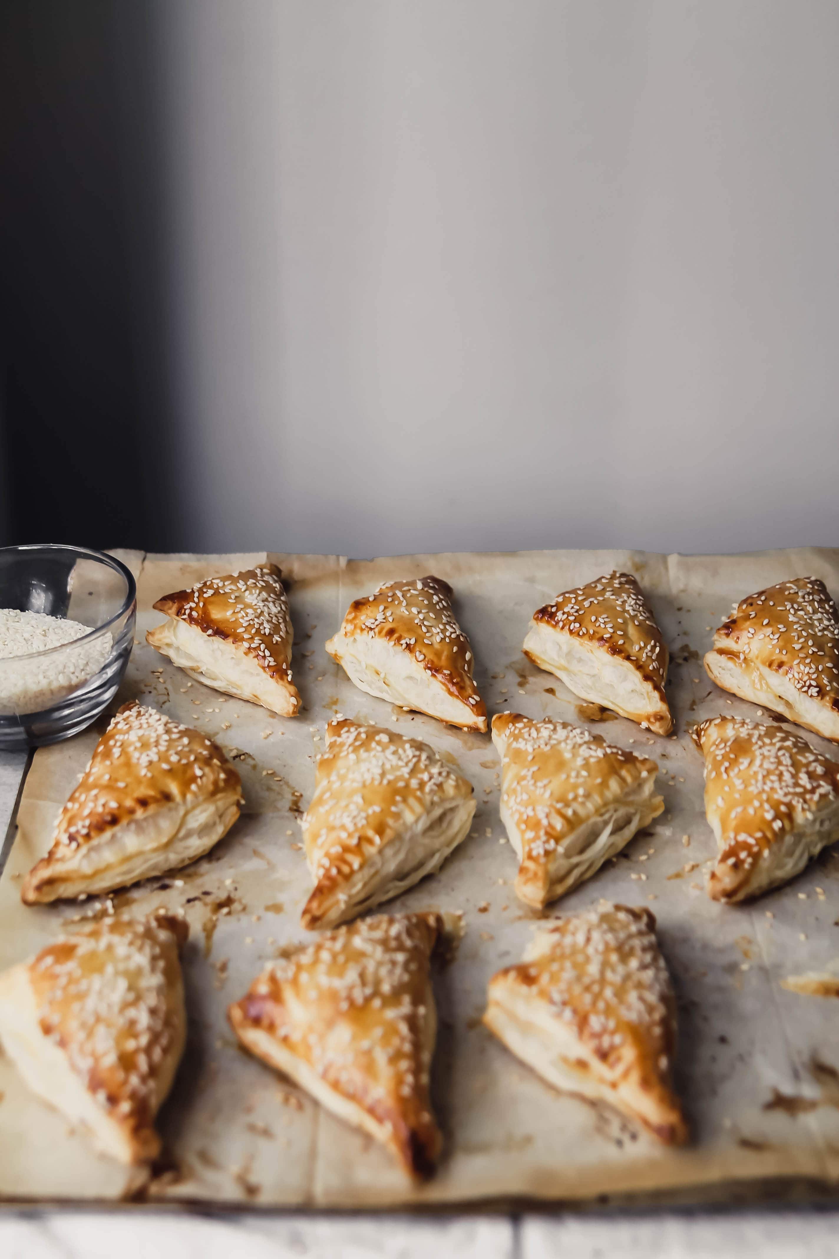 FLAKEY pockets of puff pastry filled with creamy mashed potatoes and caramelized onions – I dare you to eat just one 😉