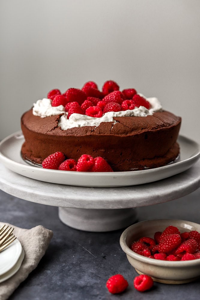 decadent and fudgy dark chocolate cake topped with soft whipped cream and sweet raspberries