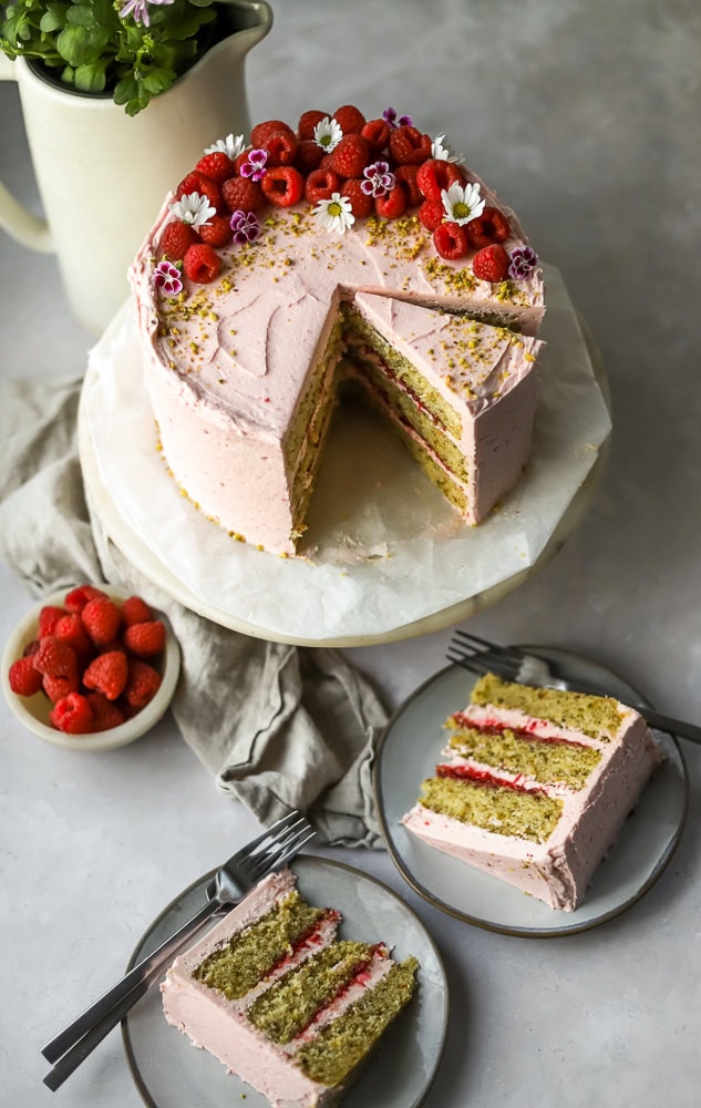 The most gorgeous pistachio layer cake filled with raspberry buttercream and homemade raspberry jam