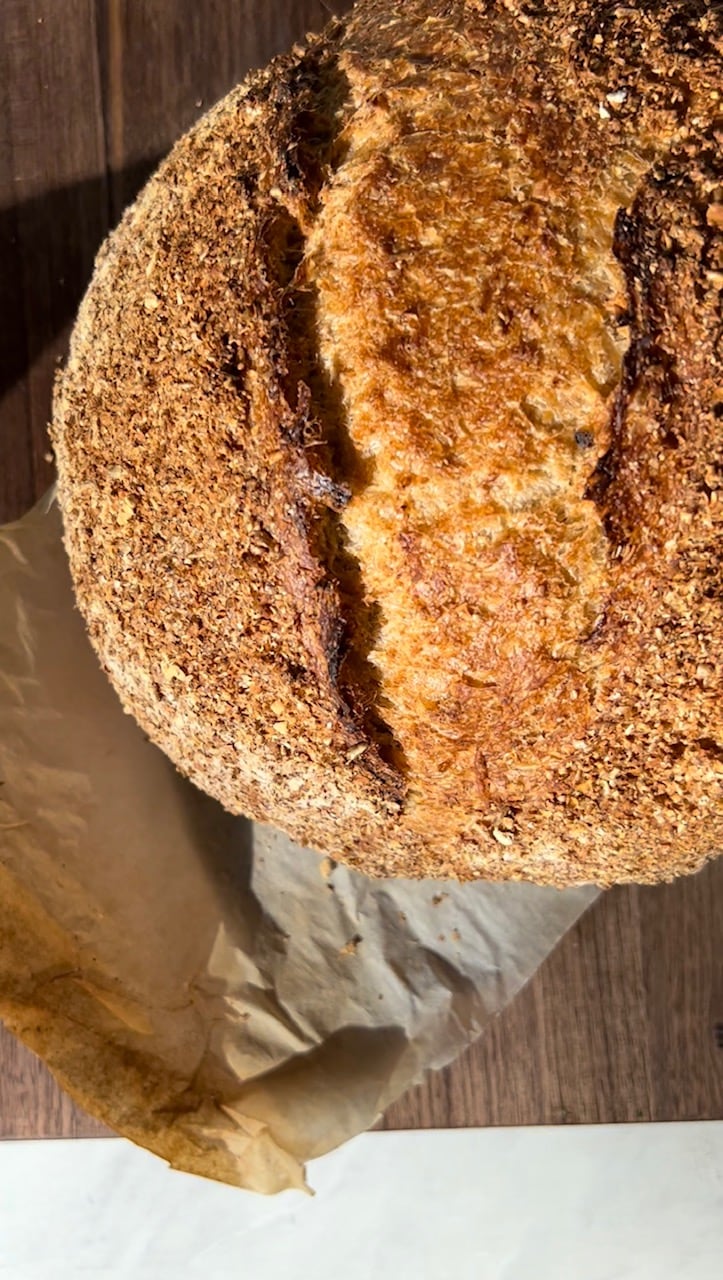 a hearty, super wholesome loaf of artisan wheat and bran bread made with a pre-ferment called a “poolish”