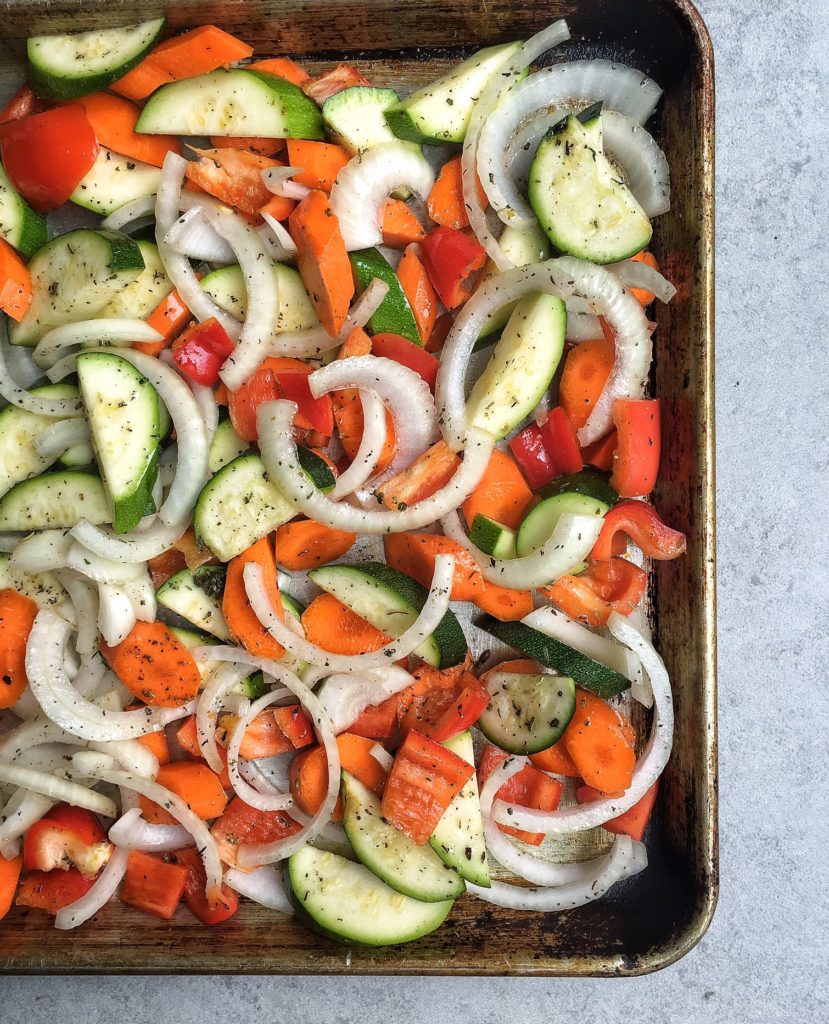 - Step 2 Chop the zucchini, carrots, and bell pepper in a large dice, and the onion in half-moons. Place the vegetables on a large baking sheet, and pour the avocado oil over all. Sprinkle kosher salt, pepper, and Herbs de Provence over, and mix well so that all of the veggies are coated with herbs and oil.