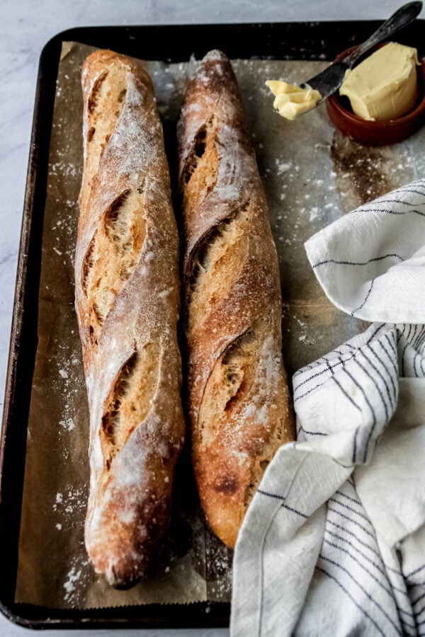 That being said, most traditional sourdough baguette recipes are a 2-3 day process to let the dough cold-proof in the fridge for 12-18 hours. This may seem blasphemous, but I’ve eliminated that step here, because I didn’t notice a huge difference in flavor or texture. Instead, the advantage of being able to mix up the baguettes in the morning, and bake them in the late afternoon before dinner was VERY appealing. I hope that you agree.